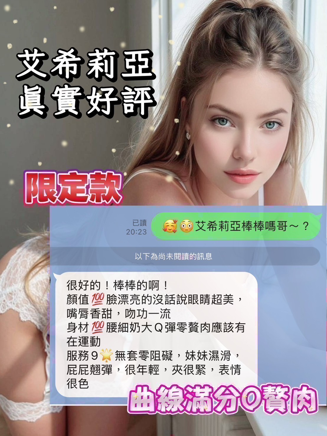 白虎無生過,多汁甜美、大眼迷人,真槍實彈、極致色誘,保證讓你魂牽夢縈流連忘返,天數不多,敬請把握啊啊啊!